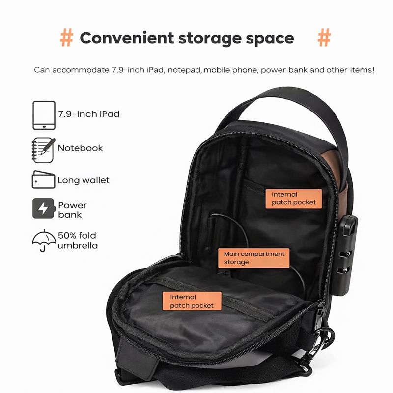 • 【USB CHARGING】This crossbody shoulder bag features a built-in USB charging port for convenient device charging on-the-go while keeping your belongings secure.This small backpack has a large capacity, size 32*22*5 cm, suitable for men, women, boys and girls. It has 3 outer pocket with chain. The sling hiking bag has two multi purpose compartment with safety lock. Pockets of thie Spiffy bag can hold personal belongings like tablets, wallets, pens, notebooks, ipads, cigarettes, cameras, thermos cups,round 5 A4 books and other stuff.
